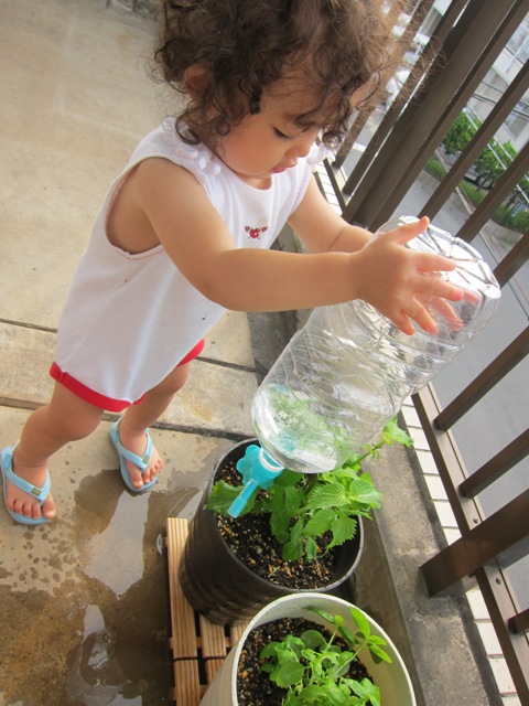 1回目の初日はまだじょうろもなく、本当にそのままのペットボトルで水やりをしていました。優花と一緒にシソ太郎たちの前に行き、こうやって水をあげるんだよと教えた後、ペットボトルを渡したら、なぜか優花が自分に水を丸かぶりしました。唖然としました。