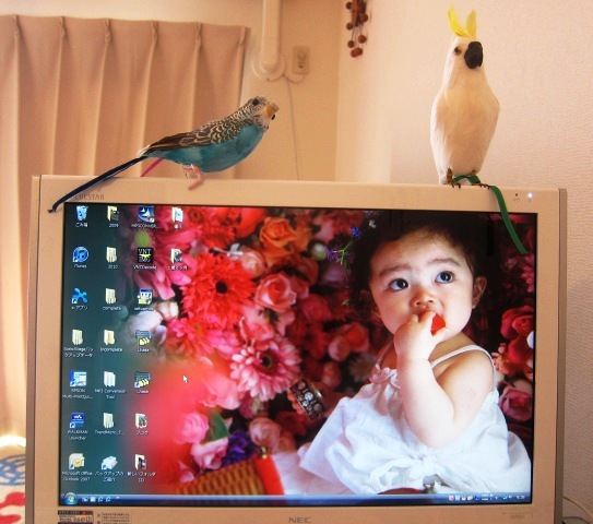 以前我が家をいっそうのカオスへ導いている2羽の鳥の話をちらっと書きましたが、その後、定位置はパソコンの上になりました。