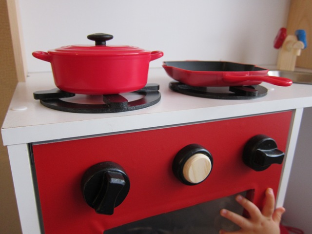 イメージしたのは、ニック社のままごとキッチンです。理想通り!!と思ったら4万円するという驚愕のお値段で諦めたもの。DIY初心者の私たちが作れるレベルで、でも気に入るものになるようにすごーく考えました。カラーボックスを使っていたり、パーツはままごとキッチン専用のお店にオーダーするなど、利用できるものの力は借りました。