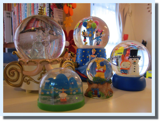 ミッキーのもの以外は全部つるにもらったものです。他にも壊れたものと失くしたものが2つありまして。もう6、7年前になりますが、つるはよくスノードームをプレゼントしてくれていました。(そんな時期もあったんです・・・)何がきっかけだったのかはお互いに思い出せないんですが、幸せな思い出の象徴みたいな感じがあります。